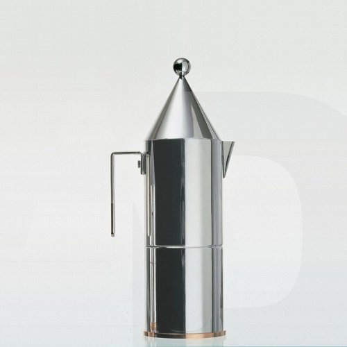 la conica espresso maker was designed by aldo rossi in 1984 and remains a popular iconic piece. made from mirror polished stainless steel with a copper base, height: 23.5cms. diameter: 7.5cms. capacity: 15cl./3 cups